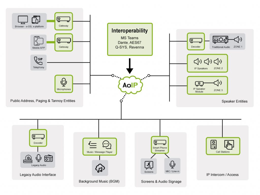 AoIP (Audio over IP) enables audio function and capability not available from traditional audio products or technologies. AoIP IP audio device entities include: IP Speakers, IP Microphones as well as configuration, control and management software / firmware. AoIP Audio Encoders and AoIP Audio Decoders are also available for interface to traditional audio systems and traditional mixing / amplification audio equipment.